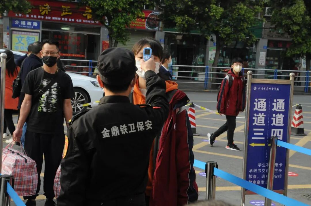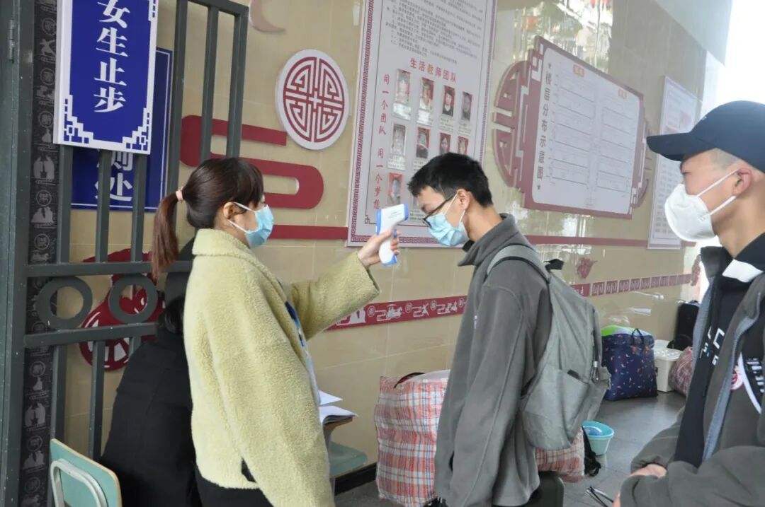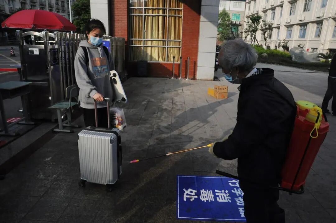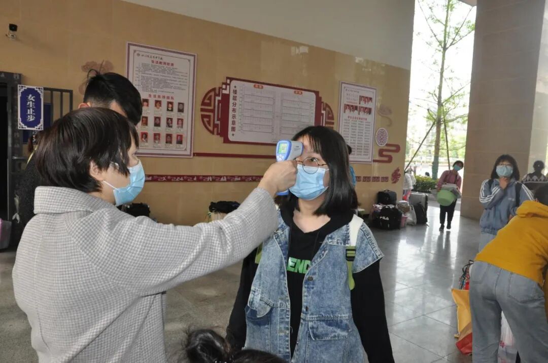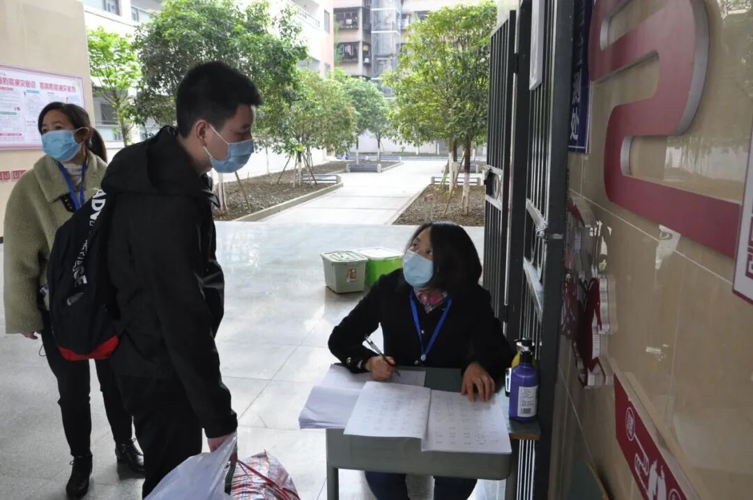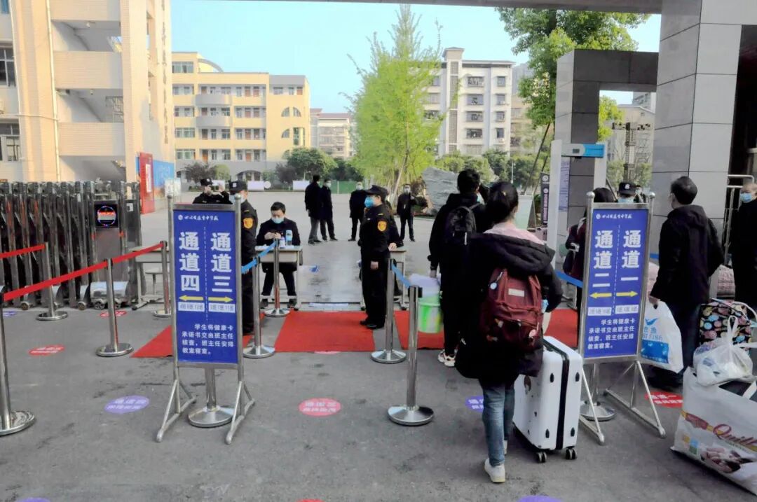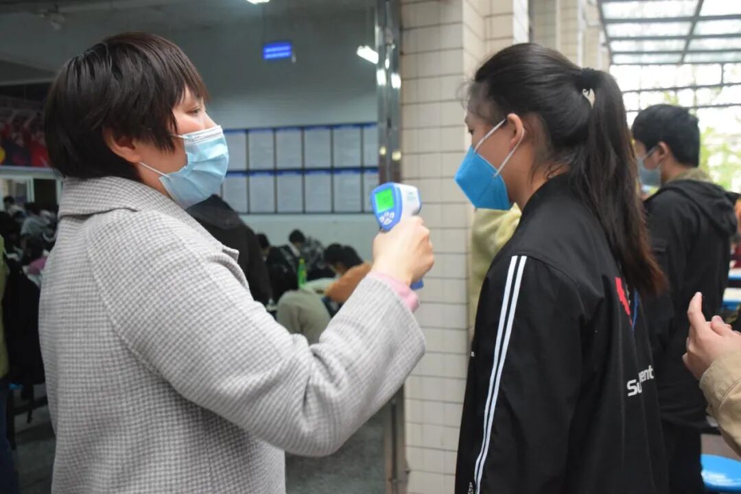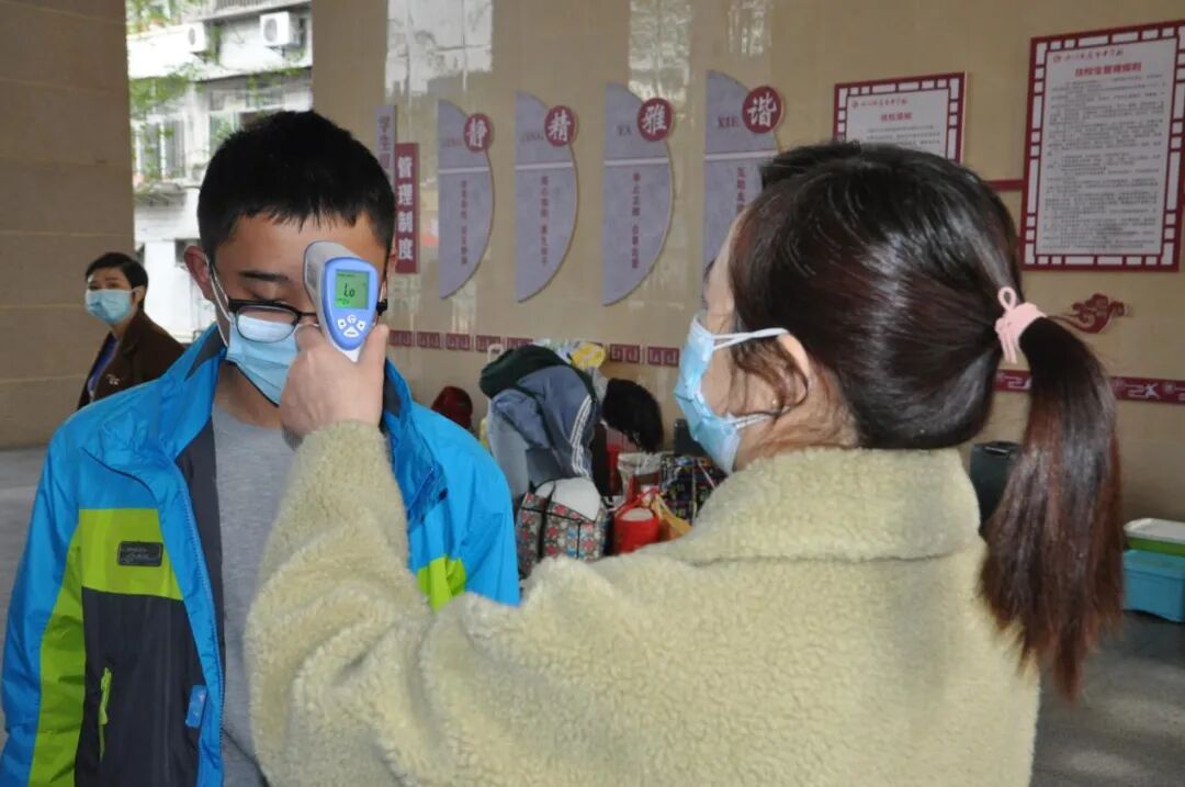 遂寧中學(xué)介福路校區(qū)嚴(yán)格執(zhí)行年級錯時到校制度,禁止家長車輛入校。入校時,學(xué)生們在體溫檢測通道保持每人間隔不低于1米的距離依次排隊,接受體溫測量與登記。無異常者按照要求洗手消毒及行李消毒,并將健康卡、防疫承諾書交到班主任處。體溫異常者(≥37.3℃),將被帶至復(fù)檢區(qū),再次接受復(fù)測、留觀、隔離、消毒等各項措施。